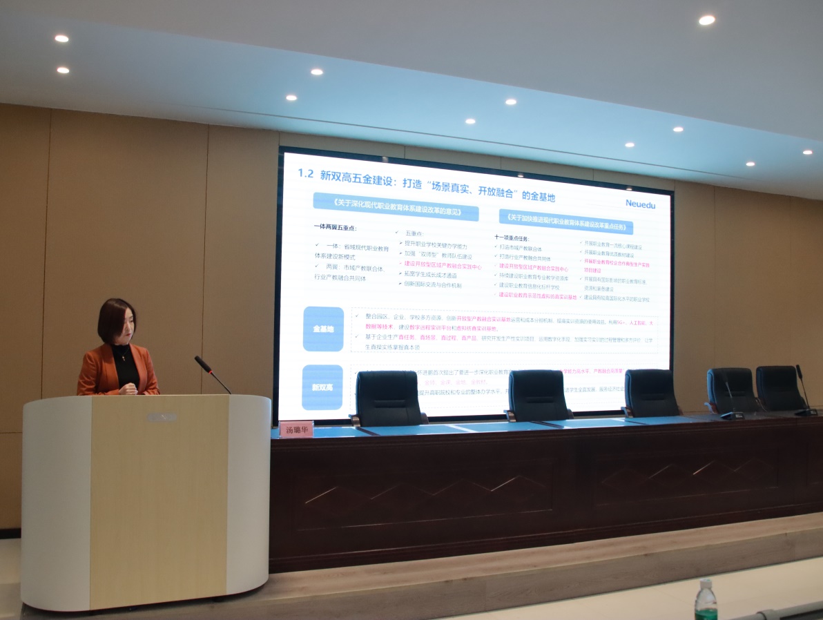 东软AI+产业融合实训基地建设方案利用 5G+、人工智能、大数据、数字孪生、虚拟现实、增强现实等数字技术,建设AI+产业赋能创新中心、真实实训环境和虚拟仿真实训基地。基地集真实生产、实践教学、科研创新、社会培训和技术服务于一体,面向区域内公司和企业开放共享,实现资源的最优配置和效益的最大化。汤璐华从建设背景、东软简介、东软的资质与能力、建设内容四个方面阐述了东软AI+产业融合实训基地建设方案,深受现场师生的关注。